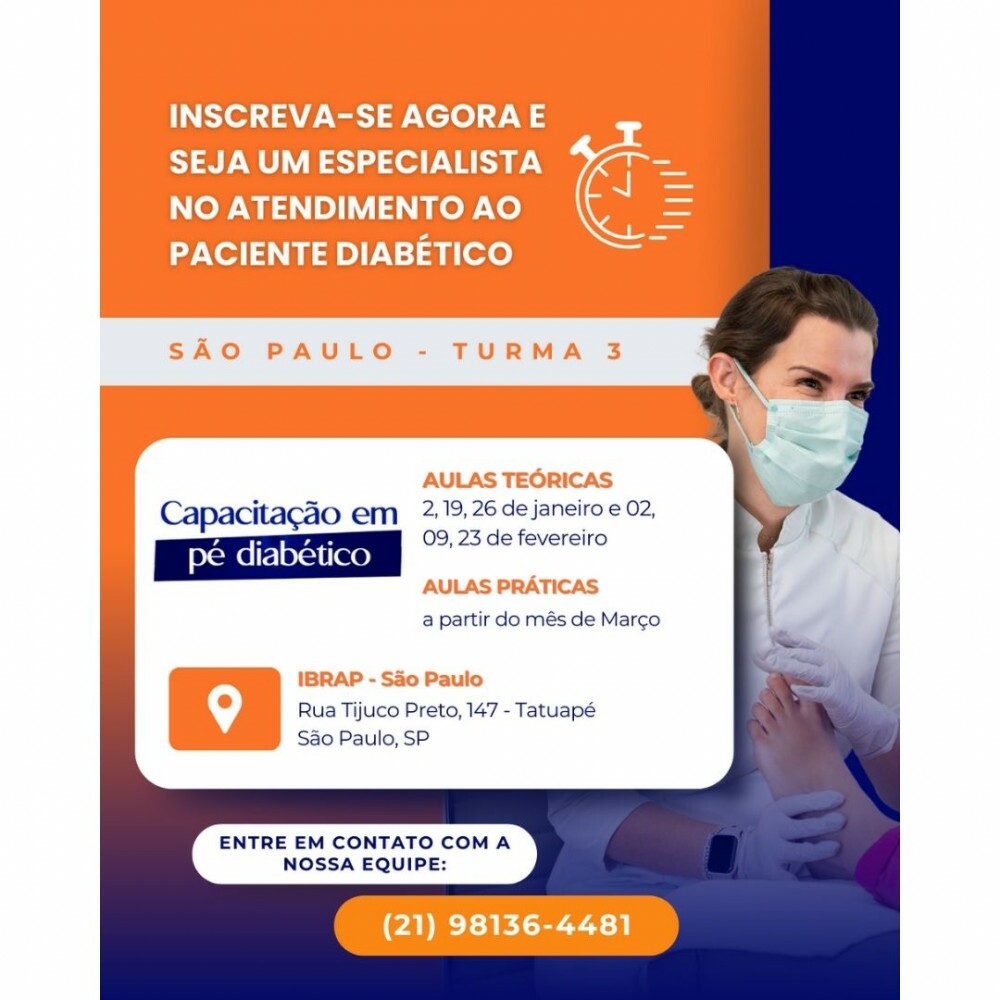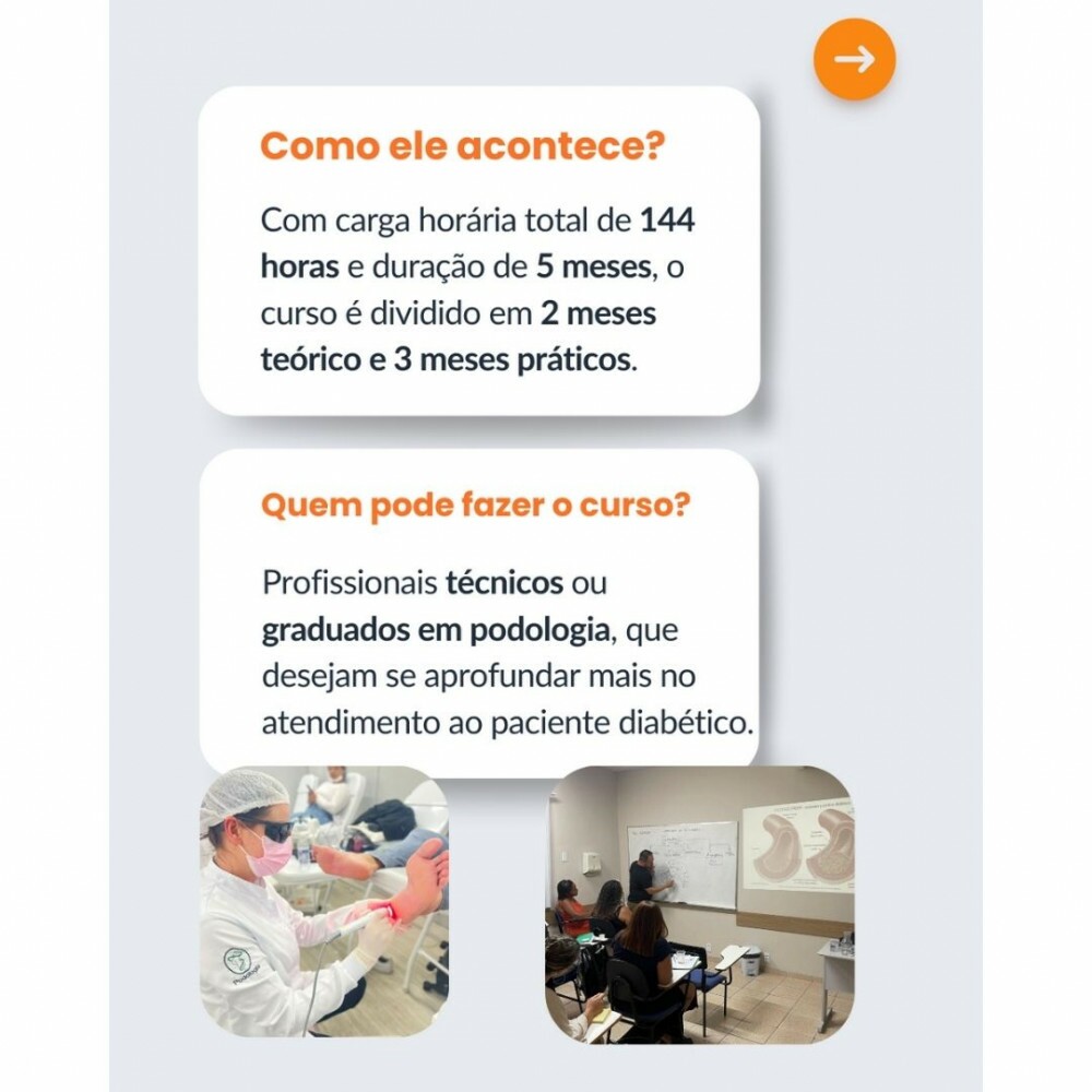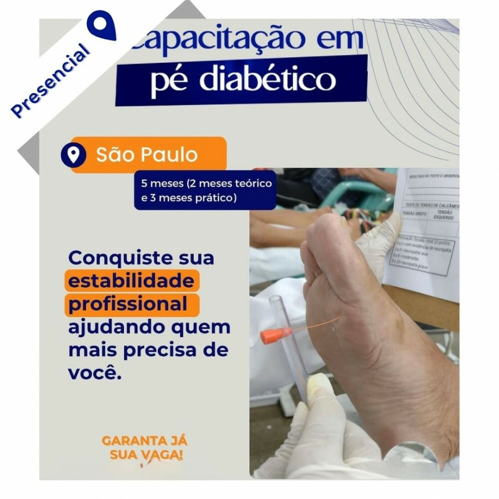 Tags: Curso presencial, Podologia, Capacitação, Pé diabético, Saúde dos pés, Cuidados com diabéticos, Formação profissional, Tratamento podológico, Cuidado com os pés, Educação continuada, Podólogo, Bem-estar, Saúde e estética, Curso especializado, Medicina podológica.