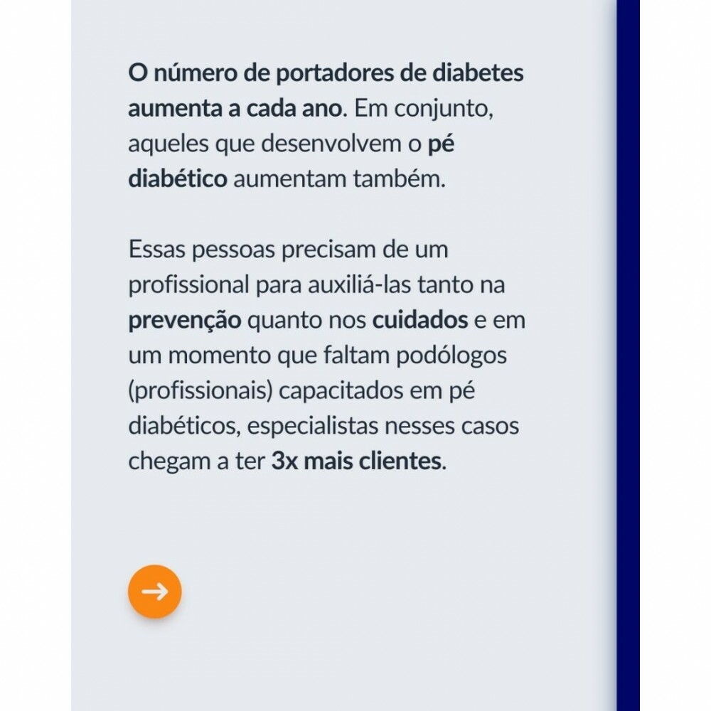 Voltado para profissionais que desejam se especializar no atendimento a pacientes com diabetes, este curso oferece uma formação completa e aprofundada sobre os cuidados e procedimentos aplicados ao pé diabético, um público em crescimento, exigente e que valoriza um atendimento diferenciado.