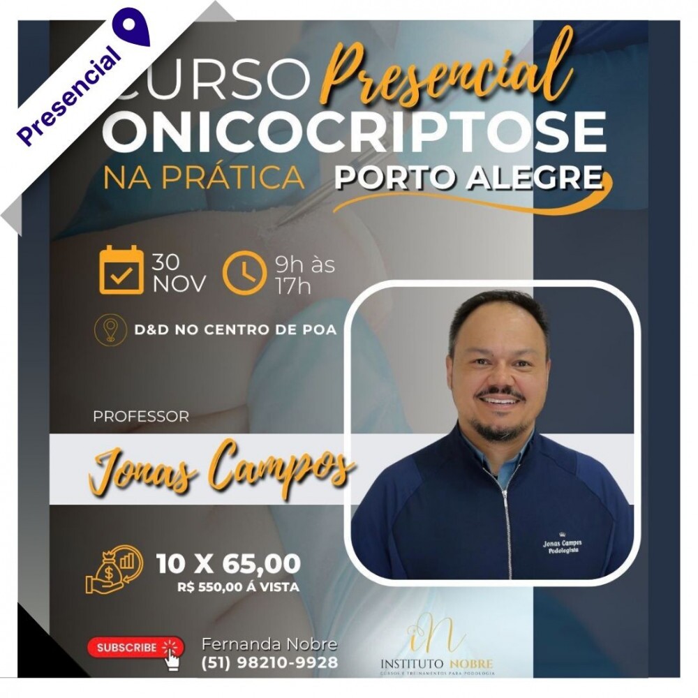 No dia 30/11, das 9h às 17h, na D&D em Porto Alegre, acontece o Curso Presencial de Onicocriptoses com o professor Jonas Campos.